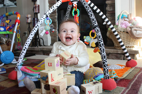 Yes, I am already 9 months old and growing up so fast. I now have 3 teeth, 1 on the bottom and 2 up top, but not in the middle...on the sides. As my Aunt Stephanie would say, "I look like a vampire." I am very active and have a hard time sitting still, unless someone is feeding me. I haven't found one food I dislike. My mommy even made me parsnips and I enjoyed them very much. I'd have to say my favorite is probably banana's. My daddy feeds them to me almost every night. It's easier when he puts them on a spoon, they are very slippery to pick up with my little fingers. I have a very big appetite for such a little person. When I'm not eating, I love reading books (I'm a very good page turner), singing in my microphone (not so good - I sound like my mommy), jumping in my bouncy and biting my stuffed animals heads. Yes, I said "biting". Just when you think I'm going in for a kiss.... I open up and chomp down. It must be part of this "vampire" thing. I always have to have something in my hands, whether it's my duckie at bathtime or I'm rolling across the floor...I have something clinched tightly in my little fist. My favorites are my bug-eyed giraffe, the TV controller or my daddy's cell phone. I few of my latest talents are...high-fiving, waving, giving kisses, clapping and mastering my sippy cup.
